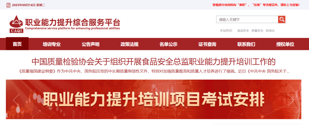 食物出产、加工企业中的高级办理人员和食物平安工做次要担任人,餐饮企业的高级办理人员和食物平安工做次要担任人,企事业单元中食物平安工做次要担任人和分担带领,畅通范畴相关企业的食物平安工做次要担任人,相关从管部分的食物平安监管人员,有志于处置食物平安办理工做的相关专业手艺人员等。培训完成报名且获得授权的进修账号后,可按照本身需要随时登录上述线上培训办事平台进行正在线年第四时度起头,拟正在每个季度的最初一个周六或周日进行培训测验(具体放置以本协会网坐发布通知为准);培训完成对应课程所需需要学时的进修后,按照相关要乞降相关登录上述线上培训办事平台正在时间内进行同一测验。第一步:正在旅逛器输入进入 中国质量查验协会官网,第二步:官网页面下滑点击“职业 能力提拔培训栏目” ,进 入职业能力提拔分析办事平台。第三步:进入《职业能力提拔分析 办事平台》点击进修中 心,点击登录。工做者,相关科研院所、大专院校、学术机构、企事业单元及质量工做取得显著成效的企业取企业担任人,取质量查验相关工做的社会相关人士等志愿结成的、行业性、非营利性社会组织,具有法人资历。中国质量查验协会筹备于1986年,并于1992年正式成立,登记办理机关为平易近政部,行业次要办理部分为国度市场监视办理总局(简称国度市场监管总局),外行业次要办理部分的对口司局为国度市场监管总局质量成长局(牵头对口司局)、国度市场监管总局承认检测司。国度市场监管总局2018年4月组建成立之前,中国质量查验协会历任营业从管部分为原国度质量监视查验检疫总局(简称原国度质检总局)、原国度质量手艺监视局、原国度手艺监视局、原国度经济委员会质量局。